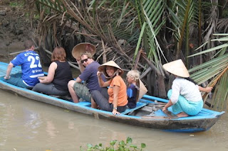 Mardi matin : départ pour le delta du Mékong, près de deux heures plus tard, arrivés à Ben Tré, nous embarquons sur des bateaux pour naviguer sur le Mékong. Les paysages sont extraordinaires sur cet ensemble de voies d'eau qu'est le delta du Mékong, un lieu ou par endroit la végétation et la nature ont été apprivoisées par l'homme...une multitude de canaux reliant les différents bras du delta de cet immense fleuve (le 10ème du monde...3 fois plus long que la Meuse). Puis arrêt pour la visite d'une briqueterie (briques fabriquées à partir des limons du fleuve...) et un deuxième arrêt pour cette fois la visite d'une fabrique de coconut candy (ce qui à fort intéressé les garçons...surtout les dégustations), un petit trajet en motocar (sorte de moto équipée pour accueillir une huitaine de personnes), et un petit trajet en barque sur un des canaux (l'un des moments les plus poétiques de ce trip...par son ambiance et son calme...),