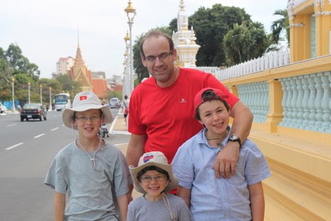 Julian commence à changer de couleur, même en nous arrêtons de temps en temps à l'ombre des rares arbres, la fin est un peu rude, il fait certainement plus de 40°C au soleil difficile à imaginer pour un 23 décembre. De retour à l'hôtel, on retrouve Magali et Caroline au même endroit que nous les avions quitté deux heures et demi plus tôt, toujours à papoter, avec à proximité, les garçons en train s'ébattre dans la piscine. L'après-midi, cool, cool et le soir on se retrouve à nouveau au resto, un moment fort sympathique. Demain, c'est le départ pour le Vietnam, Bus, frontière, bus, frontière, bus, bateau et taxi et normalement nous devrions arriver à Phu Quoc et fin d'après-midi pour retrouver Patricia, Christophe et Andrin et passer le réveillon de Noël ensemble.
