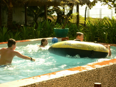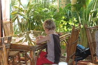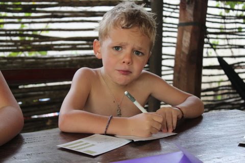 Donc après une matinée de bagarre avec les devoirs de garçons, le reste de la journée est consacré à ne rien faire du tout sauf profiter de la piscine, et mettre les pieds sous la table au resto de la guesthouse. Le soir alors que nous observons une scène de retour de pêche depuis la plage avec d'autres français, on sympathise et du coup, le soir même, on se retrouve dans le resto de leur guesthouse, puisqu'ils hébergent de l'autre coté de la route. Magali et Vincent et leurs deux garçons, Enki et Swann, viennent de Barcelonnette et parcourent l'Asie pendant 5 mois (la chance !!!!)...Les 5 garçons ne tardent pas non plus à sympathiser non plus.