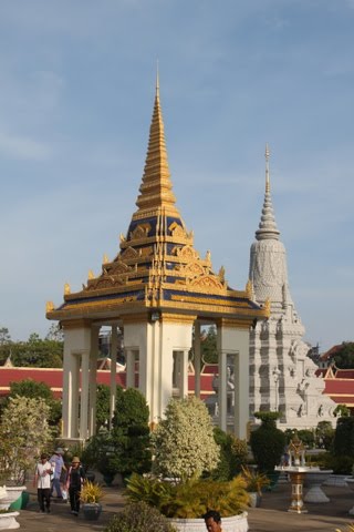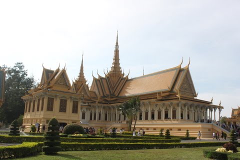 Quelques mètres plus loin, nous sommes allés visiter le palais royal (car le Cambodge est un royaume...petit rappel), c'est joli...plein de dorures, de pagodes, de bijoux, des bouddhas dorés de jardins à la française, et encore des dorures, et encore des dorures...