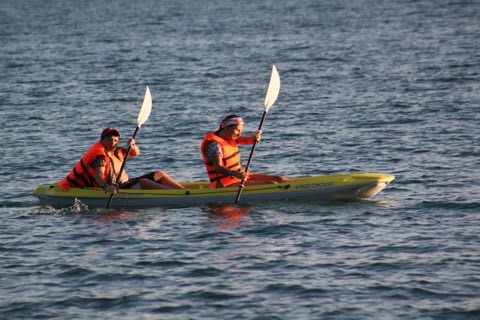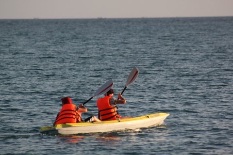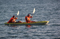 puis retour sur la plage où nous avons réservé des kayaks pour en faire un peu sur la mer. Une petite sieste et on embarque...enfin que les Gaborit, le reste de l'équipe dort encore. Un bateau avec Julian, Maël et moi et c'est parti pour rejoindre un îlot qui semble tout proche...