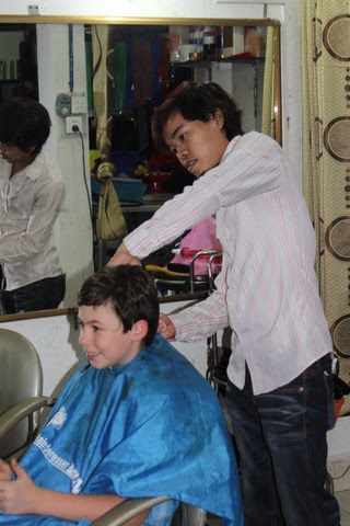 et le reste de l'après-midi, on arpente les allées du marché central où notre budget semble s'être fait attaquer de plein fouet. Petits bijoux, par ci, livres, par là, une DSI par ci et des coupes de cheveux par là (l'année dernière, les garçons étaient tous allés chez le coiffeur à Hanoï, cette fois c'est à Phnom Penh...et le tarif est sensiblement le même 2$/personne). Le résultat est sympa et ils en sont fiers. Puis le soir retour à notre hôtel préparation des bagages, on repart déjà le lendemain direction le sud du pays.