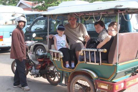 (prononcé touc-touc) de la veille nous attend comme prévu à l'heure et la patronne de l’hôtel nous salue et nous dit comme ça que le bateau est à 7h et que simplement on vient de le rater...euh, on file tout de même au port en vérifiant sur le billet...et ...mince, elle a raison...on arrive au port et comme au Viet Nam, au Cambodge, il y a toujours moyen de s'arranger, un bateau part dans 1/2h. Un gars nous attrape nos billets nos bagages et nous fait grimper dans le bateau...forcement petit moment de tension car Caroline pense qu'ils vont nous faire repayer le billet (chose qui ne serait pas surprenante de leur part) et bien non et nous arrivons à Siem Reap 6h plus tard. On remonte la rivière Sap à bord d'un speed boat puis on traverse le Tonlé Sap (le plus grand lac d'Asie du Sud). Les paysages sont surprenants quelques photos dans la rubrique diaporama. A notre arrivée au port de Siem Reap, une multitude de conducteurs de tuk-tuk, nous attend avec chacun une petite affiche « 1$, any way, any hotel, any person », comment choisir ? Oui, oui, au hasard...il nous emmène vers son tuk-tuk nous dit que nous sommes 5 et que du coup c'est 5$...de plus son tuk-tuk est trop petit pour nous emmener tous, alors on se rabat vers un autre qui nous le propose à 2$. Il nous dépose à notre hôtel et nous lui donnons rendez-vous pour le lendemain. L’hôtel dans lequel nous séjournons depuis 3 jours et un hôtel-école créée par une ONG française qui forment gratuitement 100 Khmers par an aux métiers de l’hôtellerie, l'accueil y est sympathique parce qu'il est entièrement assuré par ses étudiants un peu maladroit mais très soucieux de vouloir bien faire...et toujours avec le sourire...pour ceux que ça intéressent : www.salabai.com une bonne adresse à retenir.