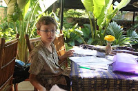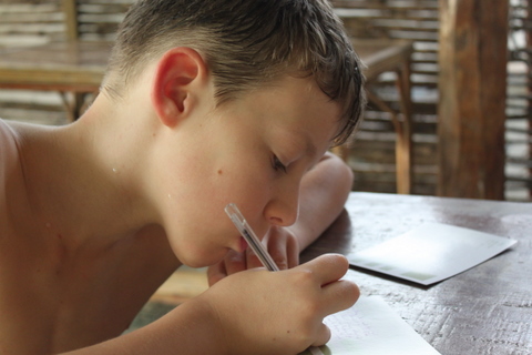 Un début de journée aussi studieux que la veille, sous la terrasse ombragée de l'hôtel, maths, anglais, allemand, français et hist-géo tout y passe malgré l'enthousiasme débordant des garçons.