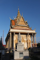 Arrivée à Phnom Penh en début d'après-midi. et là comme à chacune de nos arrivées quelque part en Asie une multitude de rabatteurs nous proposent leur hôtel, leurs excursions ou leur tuk-tuk. on laisse passer l'orage et on négocie avec un conducteur de tuk-tuk pour qu'il nous emmène à la guesthouse réservé le veille. Une bonne adresse trouvée dans la rubrique "cheap" du guide du Routard...à recommander ...un site calme et très bien agencé, un personnel accueillant et sympa...on réserve pour trois nuits à partir de dimanche soir prochain. On en profite pour récupérer un peu au calme et ensuite visite de Phnom Wat, un temple Khmer situé sur une colline servant de rond point et retour à l’hôtel en tuk-tuk.