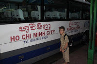 De bonne heure, nous quittons notre super hôtel, on nous avions à demander de changer de chambre...de l'autre coté, c'est coté rue et le calme n'est pas plus présent...tant pis, nous prenons le bus au Sinh café pour Phnom Penh (capitale de Cambodge).
