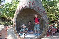 Un groupe par la plage, un groupe par la route et 10min plus tard on se retrouve au Mai Phuong, un autre resort du nord de l'île pour y déjeuner, les garçons s'éclatent dans un espèce de noix de coco géante suspendue